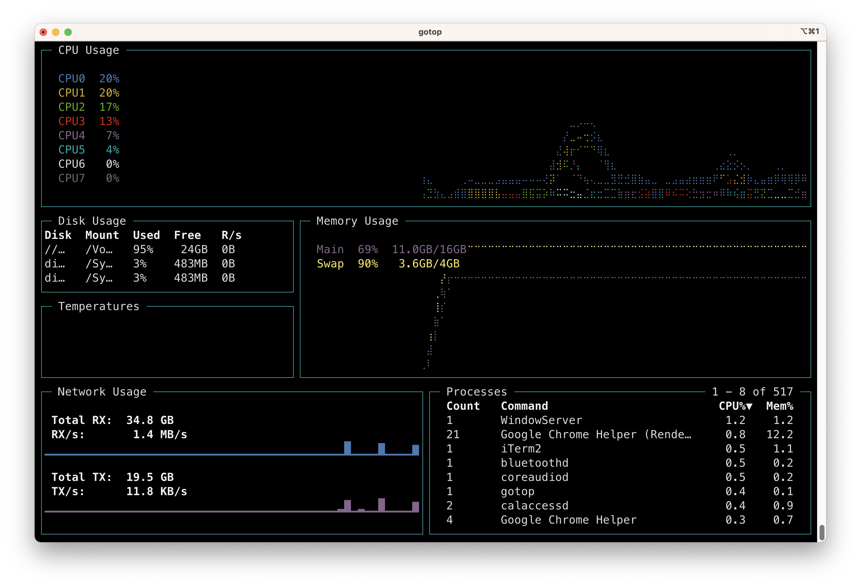 homebrew 를 이용하고 있다면 gotop 을 쉽게 설치할 수 있습니다.